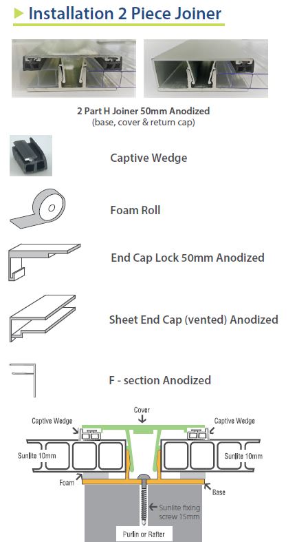 Two part joiner cover for the installation of 10mm twin wall polycarbonate roof sheeting.
